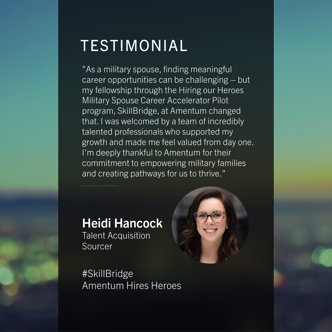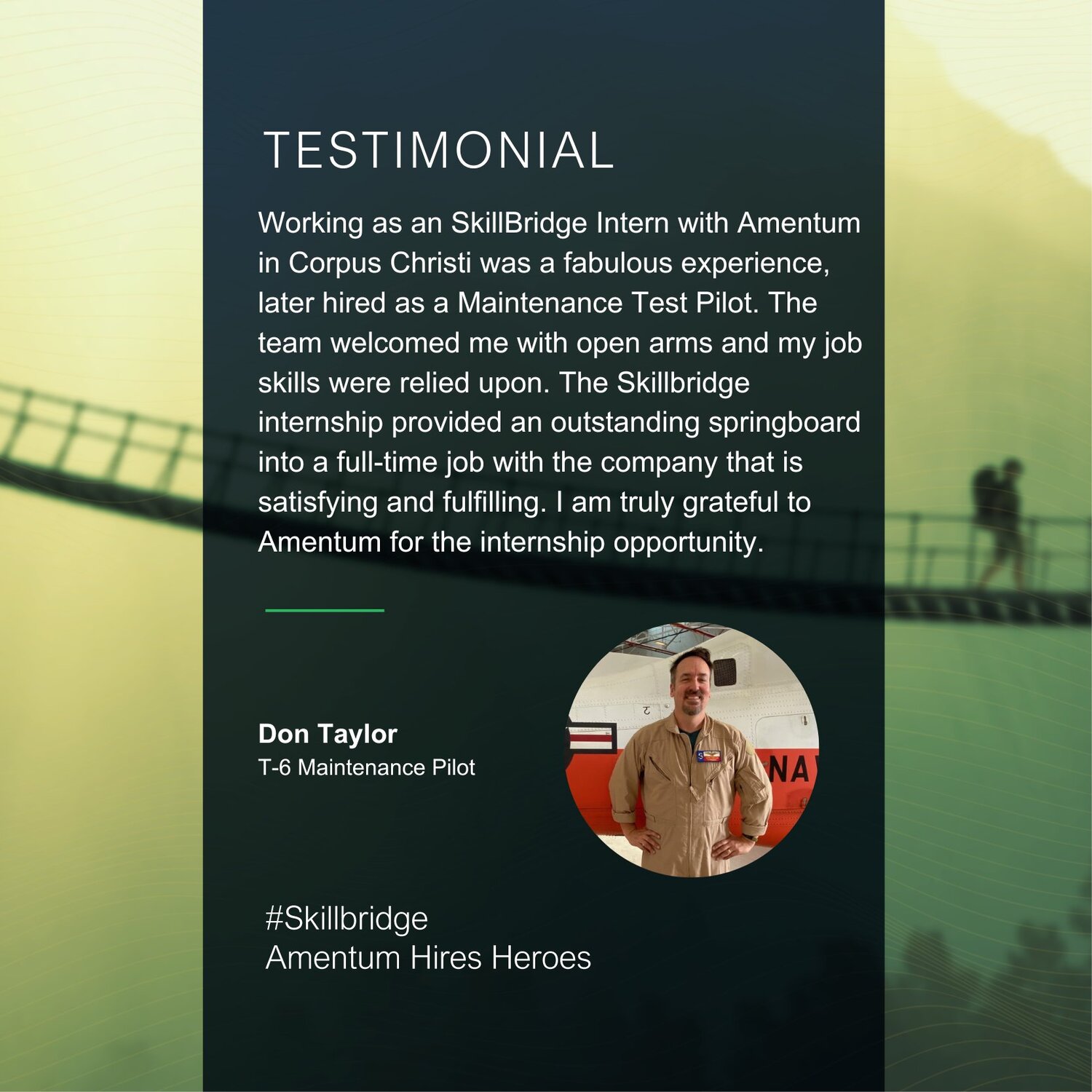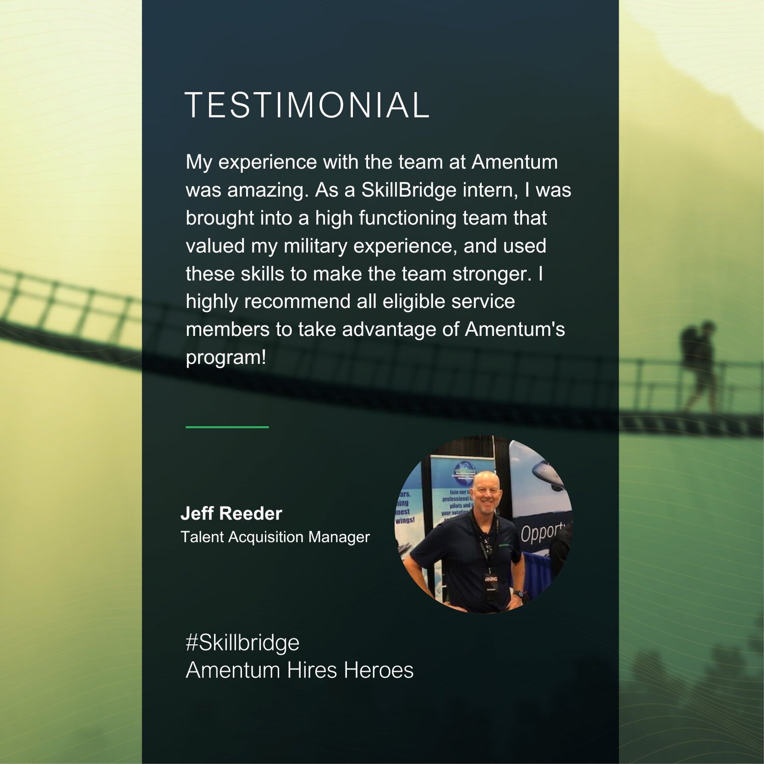 SkillBridge is part of Amentum’s commitment to hiring (and advancing) heroes. Our goal is for Service Members to be the heroes they’ve trained to be. Our heroes are doing groundbreaking work in intelligence and national security, advanced testing and training, engineering, aviation solutions, and more. Amentum’s commitment to hire heroes that help make our world a better place.