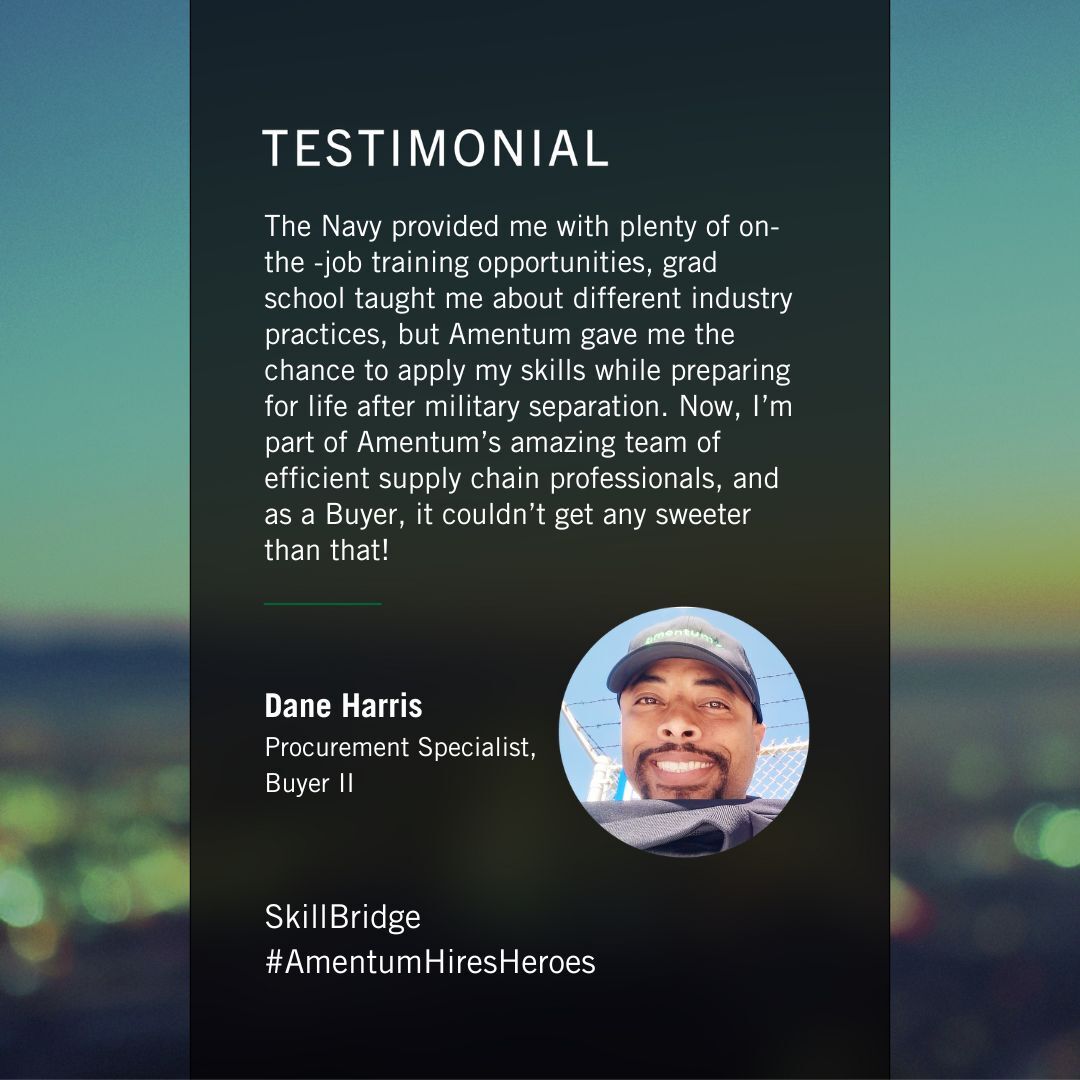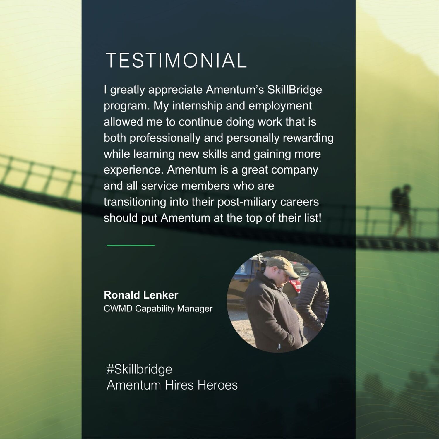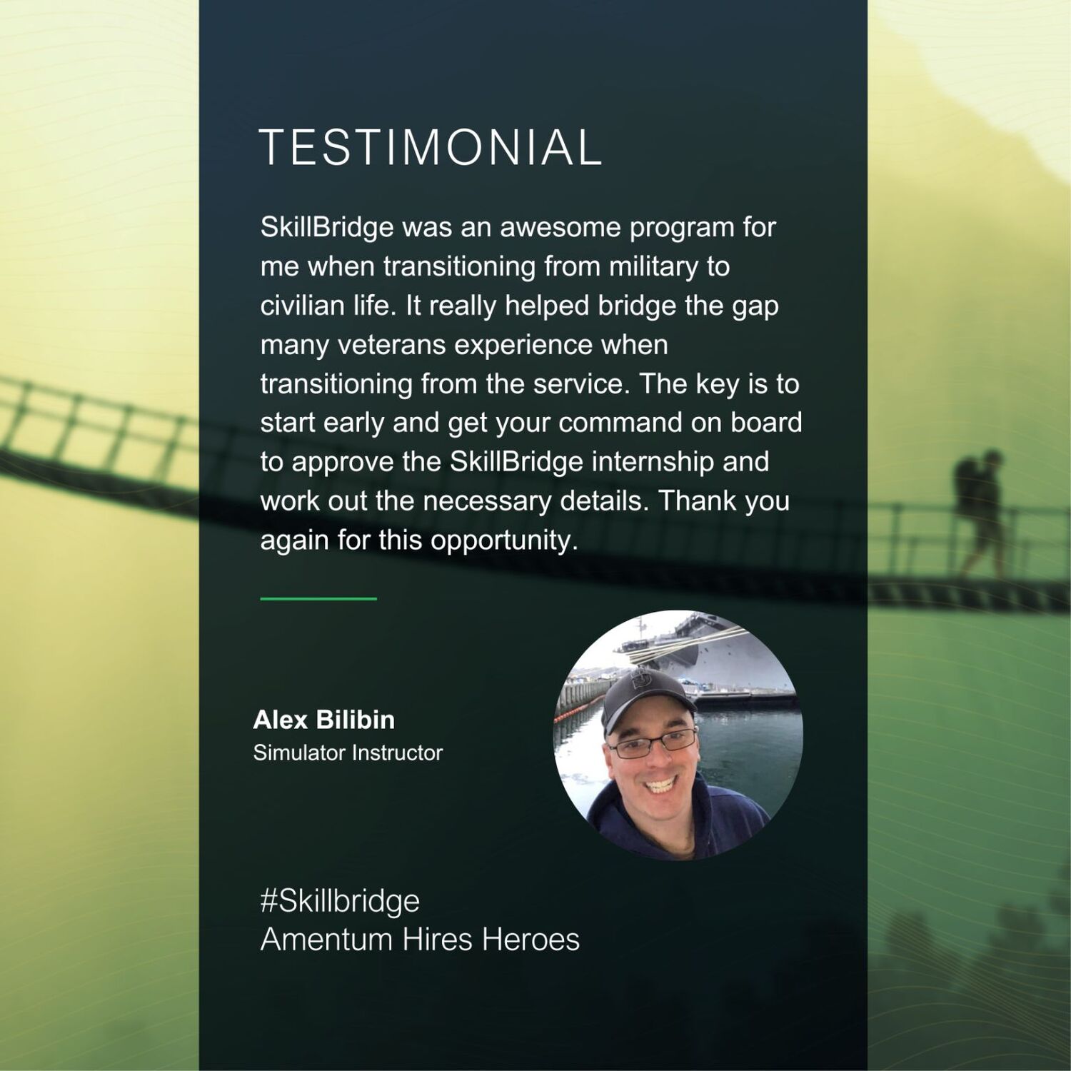 SkillBridge is part of Amentum’s commitment to hiring (and advancing) heroes. Our goal is for Service Members to be the heroes they’ve trained to be. Our heroes are doing groundbreaking work in intelligence and national security, advanced testing and training, engineering, aviation solutions, and more. Amentum’s commitment to hire heroes that help make our world a better place.