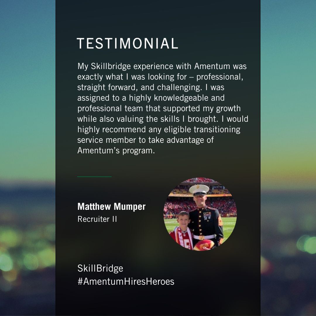 Our drive is to connect our heroic Service Members with industry leading careers and impactful work experiences.early a third of the Amentum workforce is made up of Veterans who Served in our Nation’s Armed Forces.
